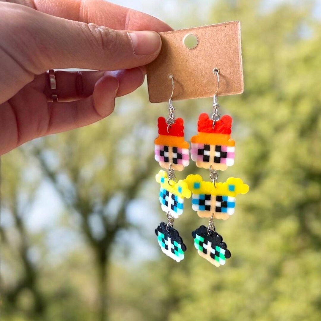 Faites à la main avec soin, ces boucles pendantes et représentent Blossom, Bulle Buttercup dans un style pixel art rétro et coloré.